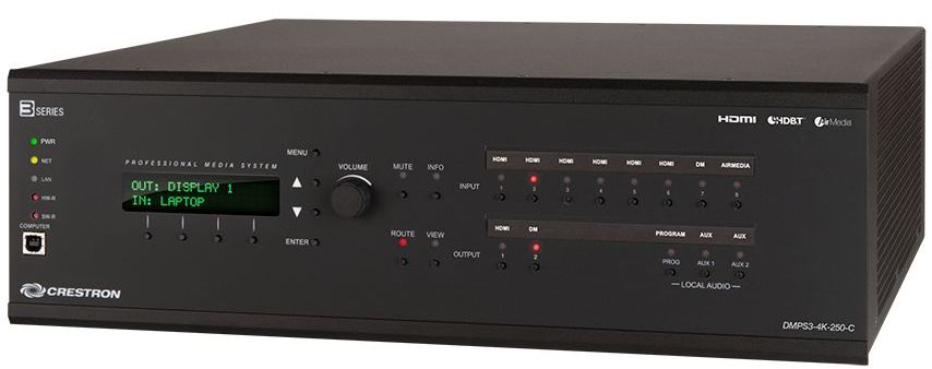 - Its built-in 3-Series control system enables the DMPS3-4K-250-C-AIRMEDIA to provide complete, customizable control of every AV device, as well as room lighting, window shades, and projection screens, without requiring a separate control processor. Onboard control ports include four IR ports, two RS-232 COM ports, four relay ports, and four digital input ports, as well as Cresnet® and Ethernet. The DMPS3-4K-250-C-AIRMEDIA supports the full line of Crestron touch screens, keypads, and wireless remotes for a user experience custom tailored to the specific requirements of each end-user. Support for Crestron control apps and Crestron Fusion® delivers the industry’s most powerful platform for remotely controlling, monitoring, and managing multiple rooms using computers and mobile devices.