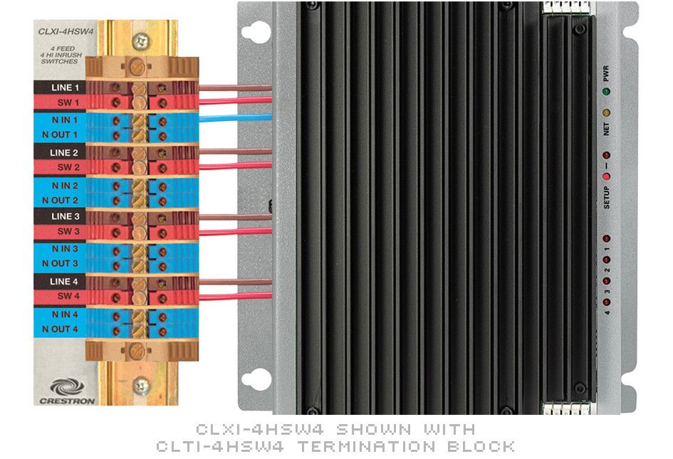 As part of a complete Crestron lighting system, the CLXI-4HSW4 module provides 4 independent channels of switching for high-inrush loads such as motors, HID lighting, and fluorescent ballasts, as well as incandescent, low-voltage, and neon/cold cathode lighting. Each channel is rated for 16 Amps or 1 HP, with a total module rating of 64 Amps when fed from four separate 16 Amp feeds. Air-gap relays are provided on every channel output allowing individual circuits to be serviced without disabling the entire module.An override feature allows each channel to be set to a preset state during setup. In the event that Cresnet communications should be disrupted for any reason, a simple contact closure can be used to activate the override presets on a global or semi-global basis.The CLXI-4HSW4 occupies a single module space in any CAEN or CAENIB automation enclosure. Termination of high-voltage wiring to the module is facilitated by a CLTI-4HSW4 terminal block, sold separately to enable termination of the wiring anytime prior to installing the module. CLXI modules are controlled by the PAC2 and PAC2M professional automation control systems via the Cresnet network. A 5-wire link provides bussing of the Cresnet and override signals between modules within an enclosure (interconnect jumpers included).