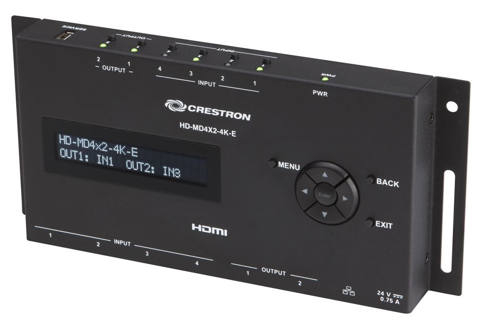The Crestron® HD-MD4X2-4K-E is a simple to use, ultra high-definition signal switcher with four HDMI® inputs and two HDMI outputs. It handles Full HD 1080p, Ultra HD, 2K, and 4K video signals with support for HDCP, 3D, Deep Color, and high-bitrate 7.1 audio. Operation is enabled using the onboard controls, a Web browser, or a Crestron control system. Simplified setup is facilitated through the front panel OLED display or a Web browser.