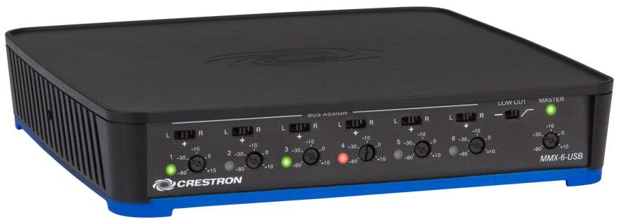 The MMX-6-USB is a compact and cost-efficient stereo microphone mixer, designed to allow up to six dynamic or condenser microphones to be connected to a Crestron RL® 2 system, CaptureLiveHD® system, or any other audio system. Its unique housing design allows for installation virtually anywhere, including under a table, on a wall, or in an equipment rack. Used with the Crestron RL 2 System Codec (CCS-UC-CODEC-200), the MMX-6-USB easily accommodates individual table microphones, as well as microphones with multiple elements like the Shure® MX396/C. It can also be used as a microphone preamp for devices like the Capture HD® High-Definition Capture Recorder (CAPTURE-HD), which does not have a mic preamp on board.