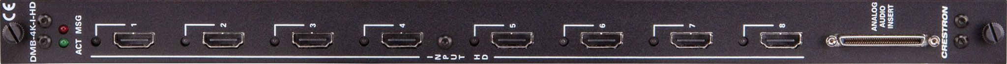 The DMB-4K-I-HD-DNT is an input blade designed for use with any blade-based Crestron® DigitalMedia™ Switcher. It provides eight independent HDMI® inputs with complementary analog audio inputs and Dante™ audio networking. The HDMI inputs are each capable of handling Full HD 1080p, Ultra HD, 2K, and 4K video signals with support for HDCP 2.2, Deep Color, 3D, and high-bitrate 7.1 audio. Support for Dante audio networking allows for interfacing with other Dante enabled equipment over the local area network to send and receive streaming stereo audio on any or all input channels. The analog audio inputs are enabled using the optional Analog Audio Breakout Box, which provides support for balanced or unbalanced stereo line-level signals.