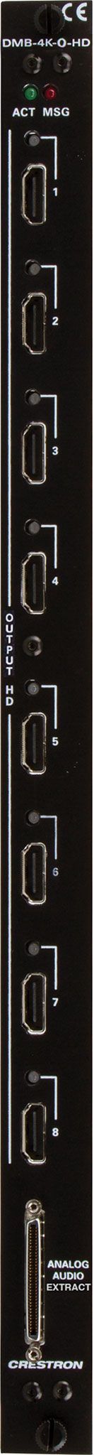 The DMB-4K-O-HD is an output blade designed for use with any blade-based Crestron® DigitalMedia™ Switcher. It provides eight independent HDMI® outputs with complementary analog audio outputs. The HDMI outputs are each capable of handling Full HD 1080p, Ultra HD, 2K, and 4K video signals with support for HDCP 2.2, Deep Color, and high-bitrate 7.1 audio. Built-in 4K scaling enables the devices connected to each HDMI output to handle any video resolution from NTSC 480i to DCI 4K. DVI signals are also supported using HDMI-to-DVI adapters or interface cables. The analog audio outputs are enabled using the optional Analog Audio Breakout Box, which provides support for balanced or unbalanced stereo line-level signals.