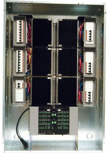 The CAENIB Series automation enclosures are designed to house Crestron's CLXI-Series lighting control modules with optional load-side circuit breakers, and a PAC2 or PAC2M control system. CAENIB enclosures are available in an assortment of sizes, suitable for surface or flush wall mount installation. Each model has been engineered to provide a clean and manageable installation with abundant provisions for wire termination and electrical knockouts.CAENIB automation enclosures are designed to use space efficiently supporting over a hundred possible circuits in the largest model. Both centralized and distributed configurations are possible. A single PAC2 control system installed in a central enclosure can support numerous satellite extension enclosures distributed throughout a residence or commercial facility. Interconnection of the complete network of enclosures requires just one circulating Cresnet cable. Dozens of keypads, touchpanels, wall box dimmers, shade controllers, and other peripherals can also be terminated within an enclosure, with separate compartments provided for high and low voltage wiring.Crestron lighting and automation systems are completely convection cooled for silent and reliable operation. Each enclosure includes a vented front cover featuring individual access doors for each group of circuit breakers. All models are constructed of 16-gauge galvanized steel and are pre-drilled for mounting of the PAC2, PAC2M, CLXI modules, CLTI terminal blocks, CLTIBN circuit breaker terminal blocks, power supplies, and a CAEN-BLOCK terminal block. Additional non-CLXI lighting modules and third-party contactors may be installed using Crestron's CAEN-UMP universal mounting plates. Grounding blocks and low-voltage partitions are included.