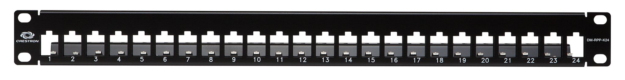 The DigitalMedia™ 24-Port Keystone Patch Panel (DM-RPP-K24) provides an enterprise-grade network routing solution that is designed in accordance with EIA/TIA specifications for use as part of a complete DM®, HDBaseT®, or Ethernet infrastructure. It can be populated with up to 24 DigitalMedia Ultra Keystone RJ45 Jacks (model DM-CONN-ULTRA-RECP), which provide front-facing RJ45 patch ports with rear-facing termination points for Crestron DM 8G® and DM Ultra Cable (or third-party CAT5e, CAT6, and CAT6a cabling). The complete solution enables the routing of data and AV signals by simply patching any two RJ45 jacks together using a DigitalMedia Ultra Patch Cable (model DM-CBL-ULTRA-PC).The DM-RPP-K24 is an empty patch panel frame with 24 keystone module positions. Each position accommodates a single DigitalMedia Ultra Keystone RJ45 Jack, which simply snaps into place without any tools. Integrated grounding tabs engage firmly with the jack’s solid metal housing to ensure proper shielding against outside interference. Individual cable tie points at the rear of the patch panel provide secure strain relief for each cable using cable ties (provided). A ground lug terminal is also included, which can be positioned on the rear at the left or right end.The DM-RPP-K24 is also compatible with most third-party keystone modules, allowing full customization using a variety of connector types to suit any application. It occupies a single rack space when installed in a 19 inch data center rack or AV equipment rack. Front panel label strips allow for the designation of each patch port using paper or standard 1/2 inch (12 mm) tape labels.Crestron DigitalMedia (DM) products are engineered in accordance with the standards and practices established by the IT and structured cabling industries. DM technology exists as an integral part of an organization’s IT network infrastructure, facilitating the distribution of 10 Gigabit Ethernet and IP streaming signals, as well as point-to-point 4K ultra high-definition AV signals. Crestron offers end-to-end networking solutions comprised of a complete family of Ethernet and DM switches, patch panels and jacks, PoE and PoDM power supplies, streaming encoders and decoders, HDBaseT and DM 8G+® transmitters and receivers, and high-bandwidth CAT5e and CAT7a cable and connectors.Please refer to the DM-CONN-ULTRA-RECP spec sheet for additional details.Please refer to the DigitalMedia Resources Webpage at http://www.crestron.com/dmresources/ for additional design tools and reference documents.