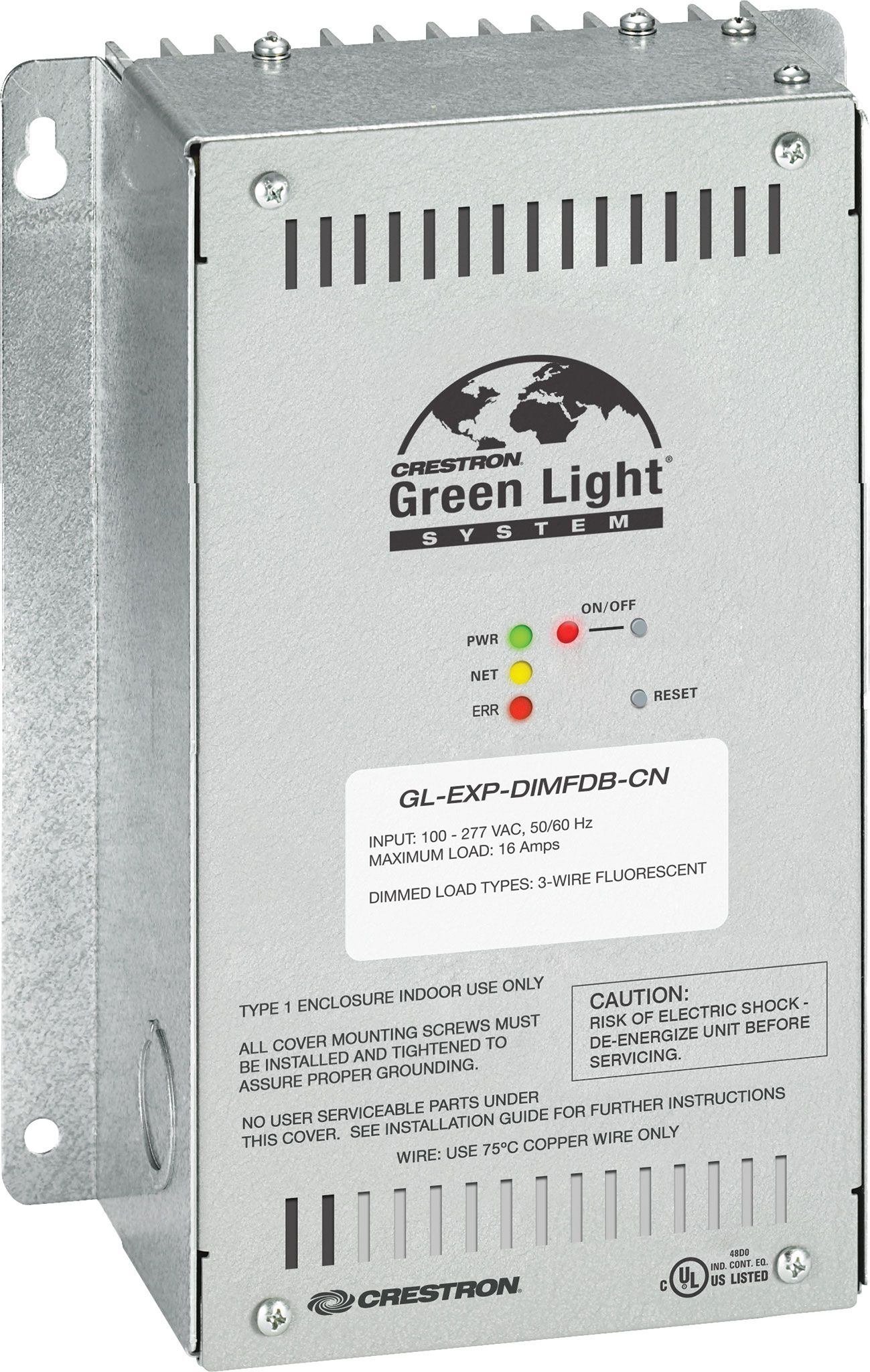 The Crestron Green Light® GL-EXP Series delivers a family of professional lighting control modules for Cresnet® or DALI® based lighting systems. Designed for easy installation on a wall or above a suspended ceiling, these modules offer a perfect solution for adding extra lighting zones to any system without requiring an additional lighting cabinet.The GL-EXP-DIMFDB-CN is a single-channel dimmer expansion module designed to control 3-wire electronic fluorescent dimming ballasts. Utilizing proprietary zero-cross filter technology, the GL-EXP-DIMFDB-CN compensates for line voltage and frequency fluctuations, providing superior immunity to power line noise and a dramatic reduction in lamp flicker.