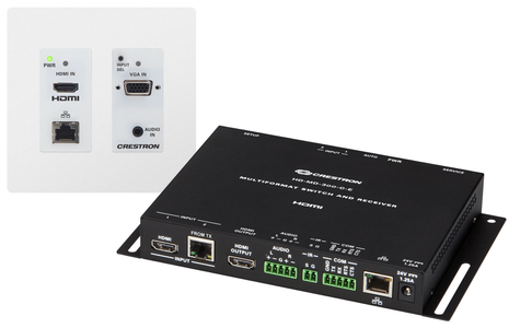 The Crestron® HD-MD-300-C-E delivers an incredibly simple and cost-effective multimedia presentation solution for classrooms and meeting spaces. It allows a laptop or mobile device (HDMI® or VGA) to be connected at a wall plate, and routes the signal to a display or projector up to 230 feet (70 meters) away. An additional HDMI source can be connected at the display device location (or through an optional wall plate near the display). Fully automatic operation detects when a source is connected or disconnected at any input and turns the display on and off, alleviating the need for any control panels or remotes. Built-in scaling ensures an optimal video image for SD and HD video signals, as well as for high-res computer signals.Composed of a compact transmitter and receiver pair (models HD-TX-201-C-2G-E and HD-RX-201-C-E respectively), the HD-MD-300-C-E installs in minutes and requires no special programming. The transmitter mounts in a standard 2-gang electrical box, while the receiver mounts behind the display or above the projector. The only connection required between the transmitter and receiver is a single CAT type twisted pair cable. A LAN port on the receiver allows for connection to an Ethernet network to enable easy setup and configuration via a web browser. Advanced functionality is enabled through integration with a Crestron control system.