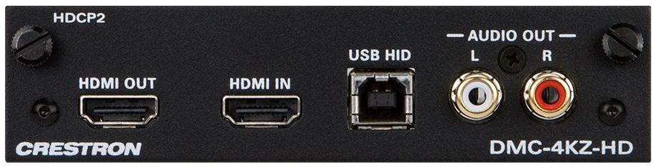 The DMC-4KZ-HD is an input card designed for use with any card-based Crestron® DigitalMedia™ Switcher. It provides one HDMI® input, with complementary HDMI pass-through and analog audio outputs. A USB HID port is also provided. The HDMI input handles Full HD 1080p, Ultra HD, 2K, and 4K video signals with support for HDCP 2.2, HDR10, Deep Color, 3D, and high-bitrate 7.1 audio. The HDMI input can also handle DVI and Dual-Mode DisplayPort signals using an appropriate adapter or interface cable.NOTE: Refer to model DMC-4KZ-HD-DSP for use with surround sound sources.