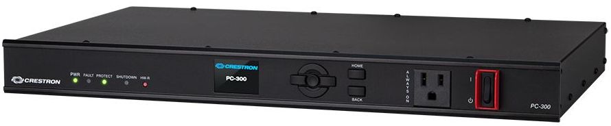 The PC-300 is a professional grade, rack-mountable power conditioner and controller designed to provide 120 Volt AC power distribution, switching, surge protection, noise filtering, and energy monitoring for Crestron® control systems, AV systems, computers, and other equipment. Eight individually-switched outlets are provided on the rear panel, plus a single unswitched convenience outlet is provided on the front. All nine outlets are protected, filtered, and monitored. The switched outlets are each turn-on delay-adjustable when controlled from the front panel power switch. The switched outlets are also individually controllable via a control system to enable independent switching of devices, on/off power sequencing, load-shedding, and other custom power control functionality.