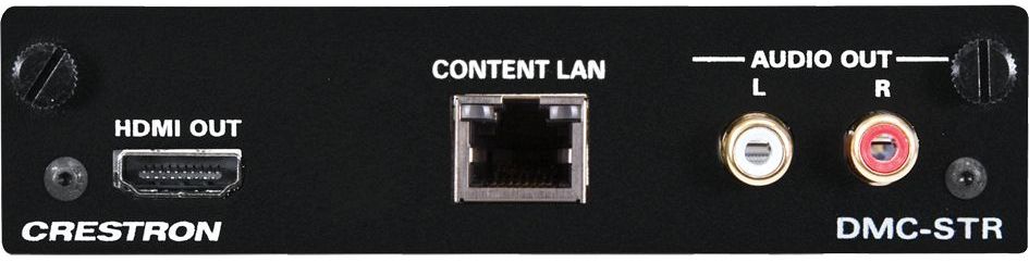 The DMC-STR is an input card designed for use with any card-based Crestron® DigitalMedia™ Switcher. It provides one streaming input, with associated HDMI® and analog audio outputs. The streaming input receives a single H.264 video stream over an IP network from another DM® switcher, an IP camera, or a streaming encoder (Crestron DM-TXRX-100-STR, CEN-NVS200, or similar).