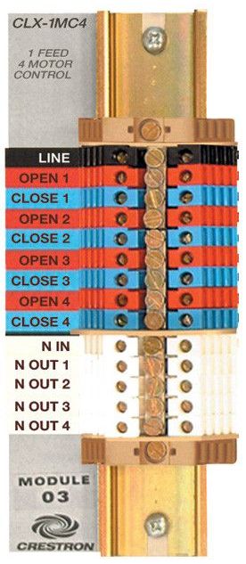The CLT terminal blocks are designed to install in CAEN automation enclosures to facilitate the termination of Class 1 high-voltage wiring for each CLX-Series lighting control module. The color-coded DIN rail design, complete with printed label strips and mounting hardware, provides for a clean and simple installation. Electrical bypass jumpers on each terminal facilitate testing of each circuit and protect the module during installation. Each CLT terminal block assembly weighs approximately 0.5 lb (0.23 kg).