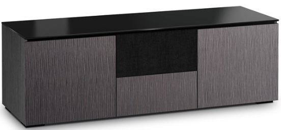 Lightly textured, alpi gray oak doors with black, tempered glass top and black oak finished end panels